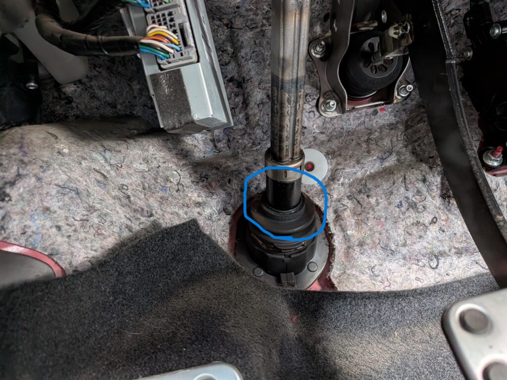 ステアリングシャフトは、運転席を潜り込んでペダルの奥にあります▼