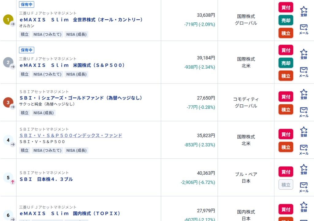 最低でもオルカンの約4倍の手数料が発生する銘柄しかないので、長期運用すると手数料の分かなり損をしてしまいます。