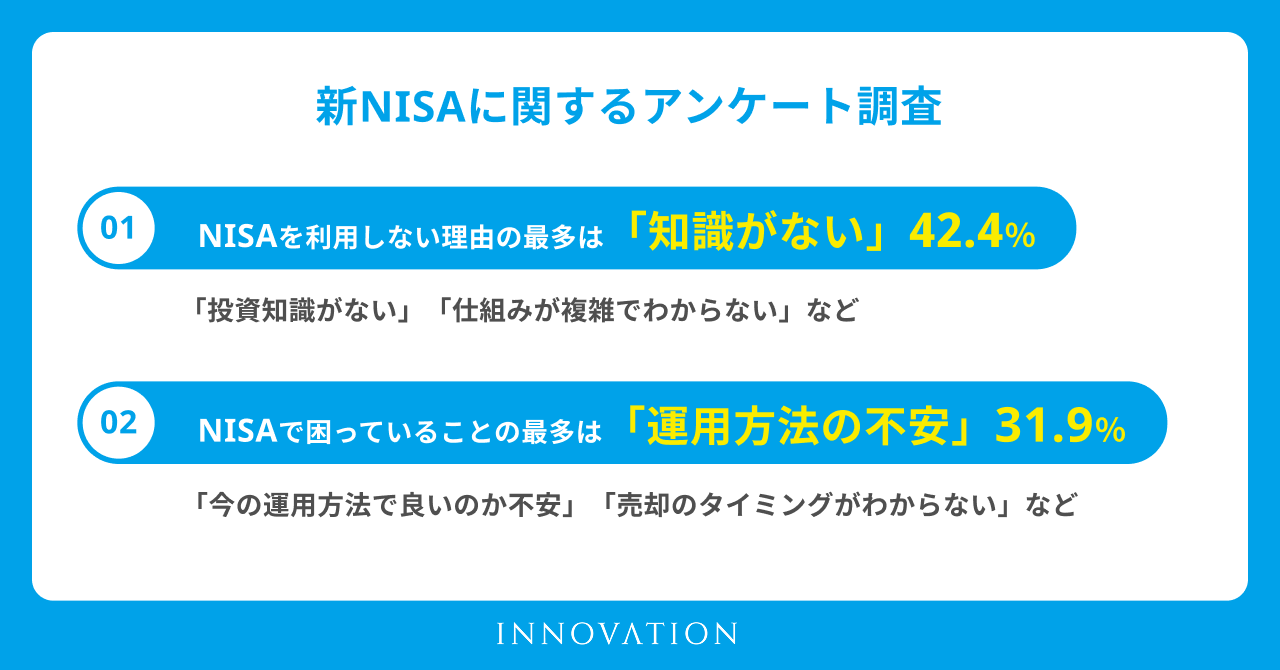 引用元:株式会社イノベーション『新NISA開始1年半で総買付額累計59兆円、普及率24.8%、買付未利用38%、「仕組みが複雑でわからない」「どの商品を選べばよいかわからない」〜 新NISA利用者のリアルな実態調査 〜』