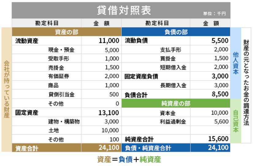 貸借対照表とは、企業の資産、負債、純資産の内訳を示す表で、財政状況等が分かります。