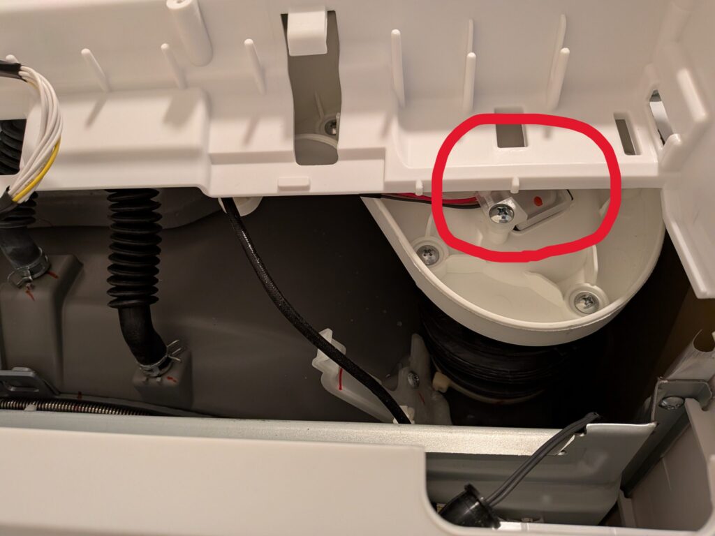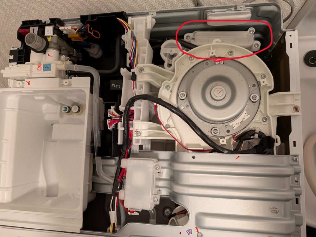 原因となった湿度センサーは、上面の操作パネルを外した奥の、赤丸のところにあります▼