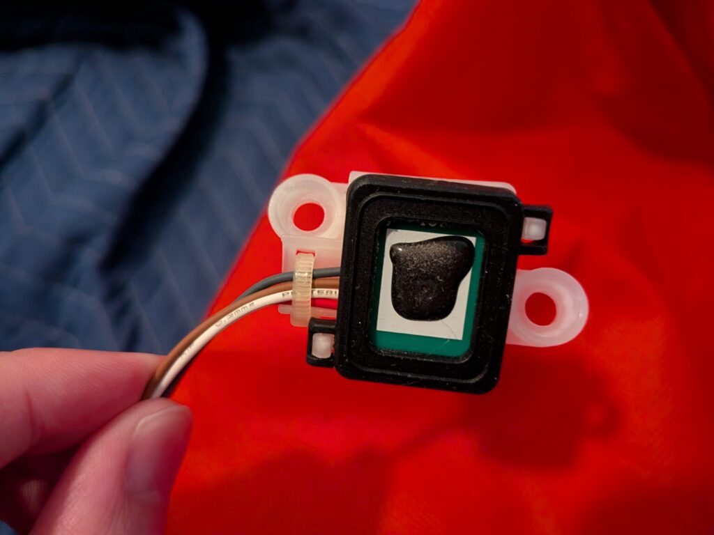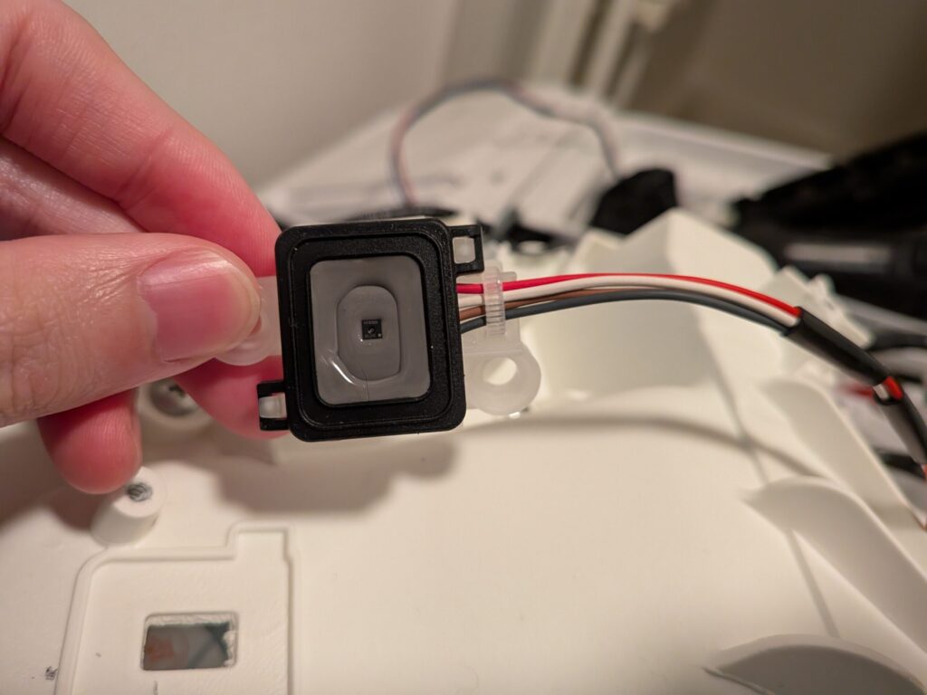 この湿度センサーを取り外します。洗濯機側がこんな感じで、中心の黒いものが接着剤なのですが、かなり雑だなと思いました▼