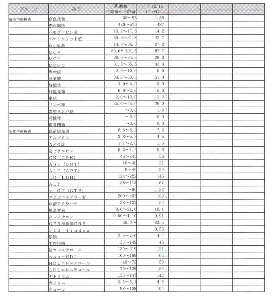 全体として、肝機能(AST, ALT, γ-GTPなど)や腎機能、血糖関連の数値は非常に良好です 1。しかし、ご自身でも気づかれた通り、脂質項目とコリンエステラーゼが基準値を下回っており、現在の食生活が**「エネルギー不足(特に脂質とタンパク質)」**に傾いている可能性が示唆されます 2。