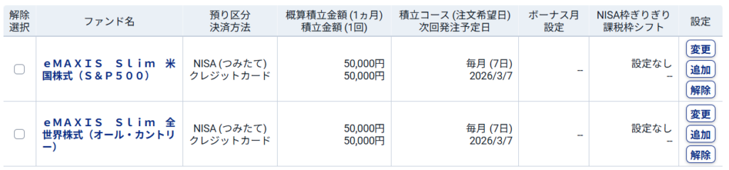 銘柄はS&P500とオルカンで5万円ずつにしていますが、近いうちにどちらかに統合するつもりでいます。