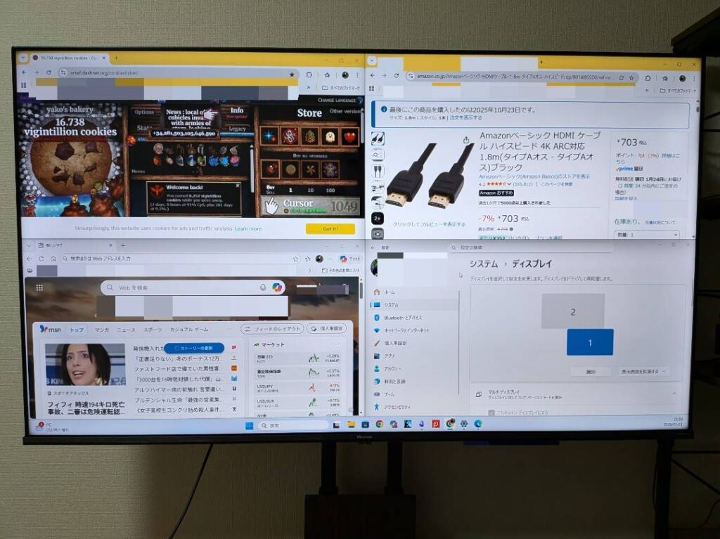 50インチもあるので、4画面に分割しても余裕で作業できます